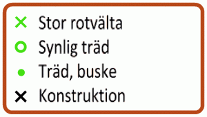 Kartan visar eventuella farliga stup eller branter (utmärkta med förstärkt streck på kartan) som kan ligga längs med rutten, se bilden nedan. Det är förbjudet att kliva upp eller hoppa nedför dessa stup/branter.