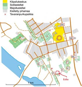- EsSun majoitustelttapaikat löytyvät teltta-alueelta F, josta matkaa kilpailukeskukseen on alle kilometri.