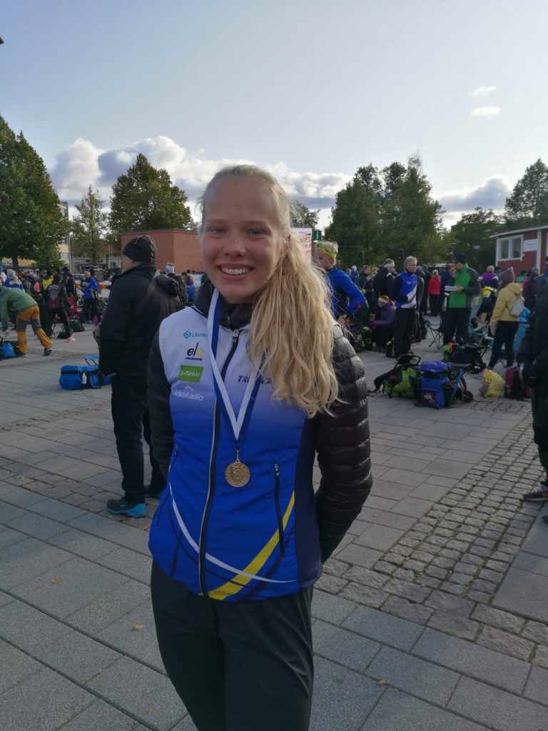 Nuorimpien tyttöjen sarjassa (D14) tänä syksynä todella kovaa juoksuvauhtia osoittanut Silva Kemppi otti kultaa. Nuorten maajoukkueeseen kuuluva Melina Lahdenperä (kuvassa) sai kultaa sarjassa D18. Leo Pyymäki otti jälleen yhden SM-kullan, nyt sarjassa H55. Edellinen kultahan tuli Letsille Fiskarsin SM-pitkällä pari viikkoa sitten. Vanhimpien herrojen sarjassa Pertti Laurila oli nopein, Pertilläkin on useita SM-mitaleita ja Letsin tavoin myös Pertti sai kultaa Fiskarsista.