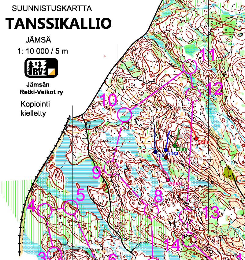 Leiri alkoi varhain tiistaiaamuna Espoossa, kun lähdimme matkustamaan kohti Jämsää. Ensimmäinen treeni oli Ouninpohjassa, jossa teimme pitkän harjoituksen tutustuen uuteen maastotyyppiin. Maastossa korkeuserot ja jyrkät kalliorinteet yllättivät, mutta muuten maasto vastasi esimerkiksi tuttuja Nuuksion maastoja.