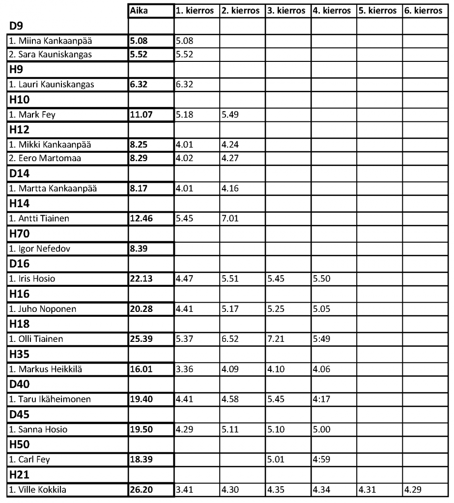 Tässä kisan tulokset kierrosaikoineen. (Valitettavasti pari kierrosaikaa jäi saamatta, mutta loppuajat on kaikilla!)