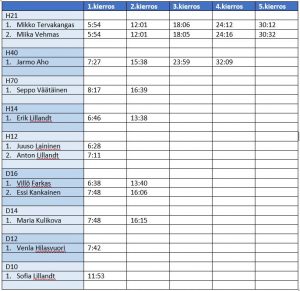 Miesten pääsarjan ja samalla koko seuran kovimman tuloksen juoksi Mikko Tervakangas – viisi kierrosta eli 8 km aikaan 30:12. Kamppailu Miika Vehmaksen kanssa oli tiukkaa loppuun asti, sillä toisiksi viimeiseen kierrokseen asti miehet paukuttivat tasaista vauhtia lähes rintarinnan. Nopein nainen kilpailussa oli D16 -sarjassa loistavasti juossut Villo Farkas, joka pinkoi kaksi kierrosta kokonaisaikaan 13:40.