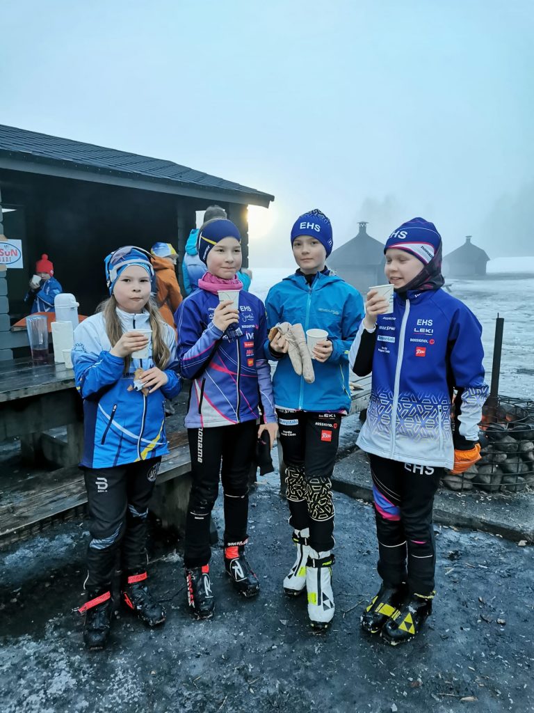 Hiihdon jälkeen maistui kisailijoille sekä huoltojoukoille Essun baarin tarjoilemat makkarat ja mehut.