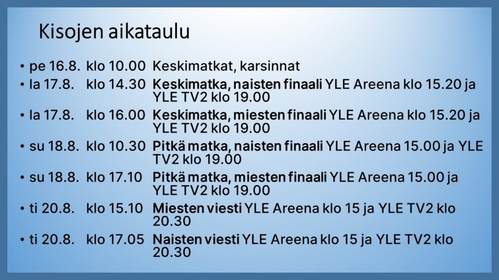 Kisoissa on ohjelmassa ensin perjantaina keskimatkan karsinta. Sen lähtöajat ovat jo selvillä ja alempana on essulaisten lähtöajat. Lauantaina juostaan keskimatkan finaali. Ensin on naisten kisa ja sitten miesten kisa. Pitkän matkan kilpailu on sunnuntaina. Siihen ei ole erikseen karsintaa. Maanantai on välipäivä ja kisat huipentuvat tiistaina juostaviin viesteihin. Niissä miehet juoksevat ensin ja sitten naiset.