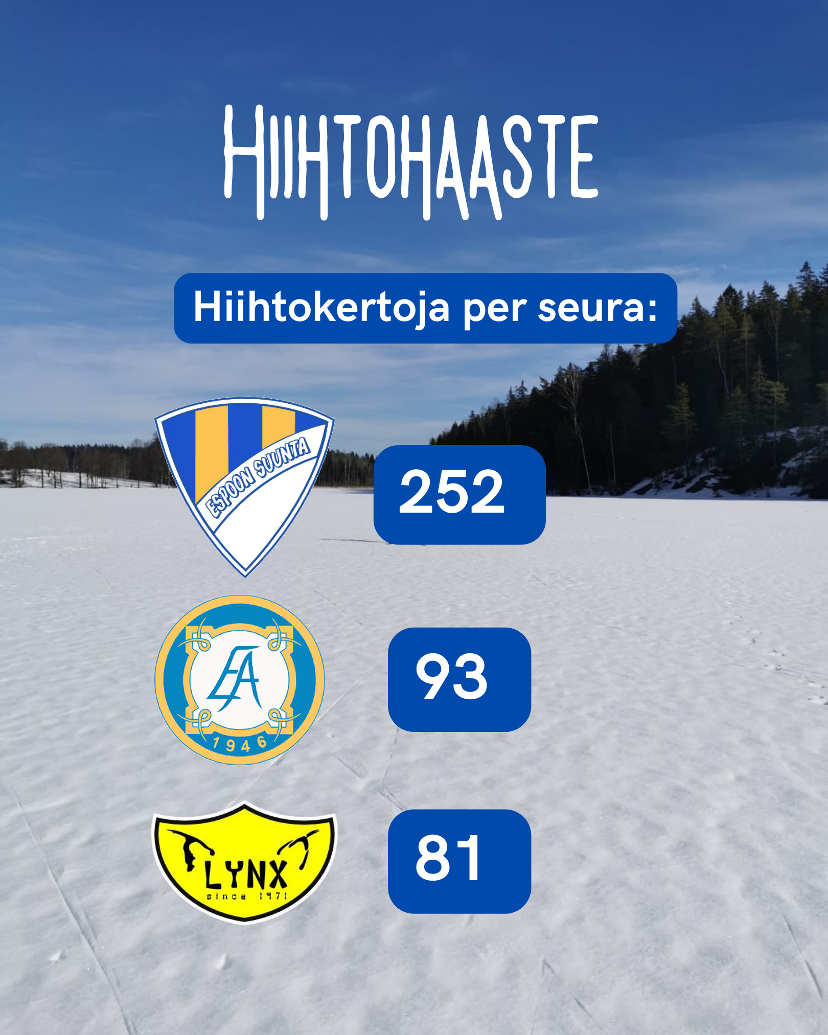 Tämä oli nyt kuudes talvi peräkkäin kun Essu on haastanut muita suunnistusseuroja hiihtämään. Viime vuonna haastettiin Tampereen Pyrintö ja Helsingin Suunnistajat. Pyrintö vei voiton ja pienenä osasyynä taisi kyllä olla se, että pääkaupunkiseudulla oli viime vuonna aika huono latutilanne haasteen aikoihin. Tänä vuonna ladut olivat kunnossa, kiitos siitä Espoon mahtavalle latutiimille!