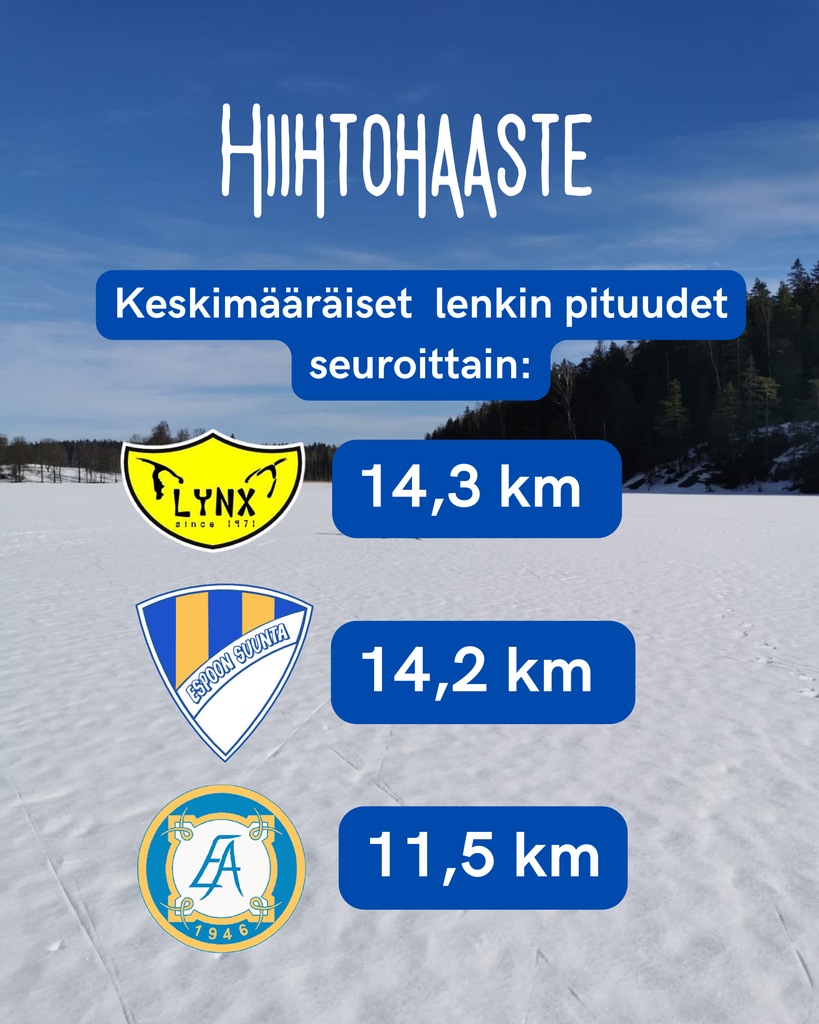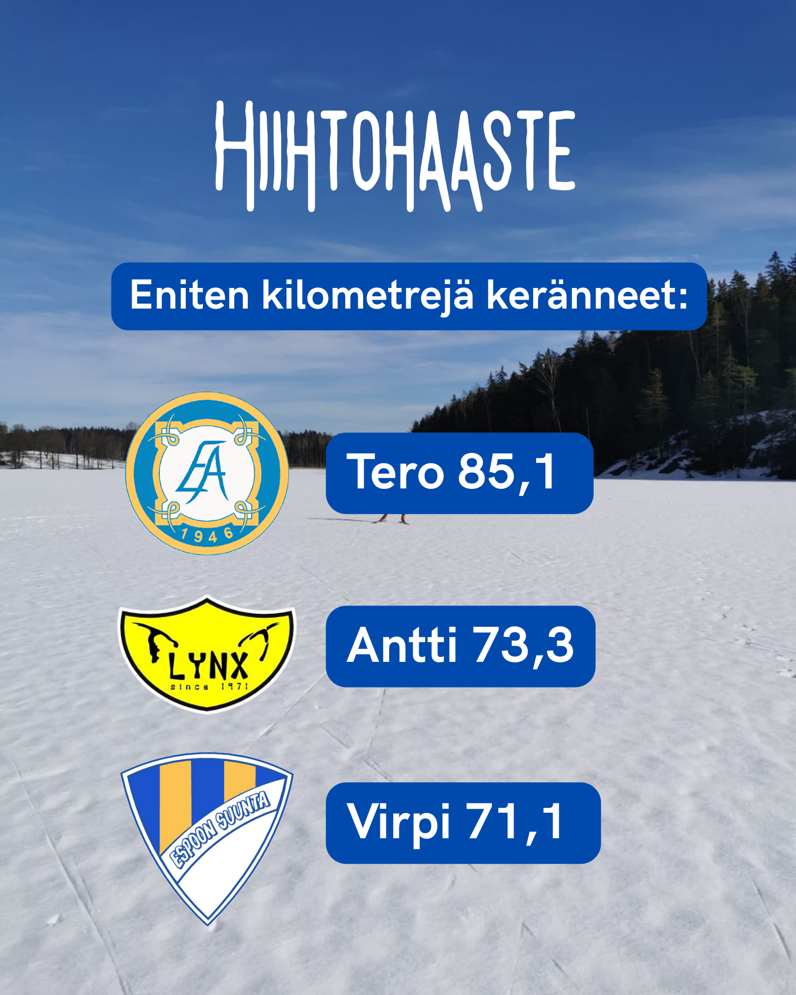 Saavutimme tänä vuonna aika ylivoimaisen voiton. Kilometrejä kertyi peräti 3588,86 ja se oli jopa enemmän kuin Akilleksin ja Lynxin keräämät kilometrit yhteensä. Lynx oli kakkonen (1154,18 km) ja Akilles niukasti kolmas (1066,41 km). Yhteensä hiihtohaasteessa kertyi kilometrejä 5809,45.