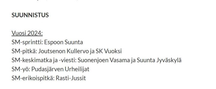 Suomen Suunnistusliitto on myöntänyt suunnistuksen, hiihtosuunnistuksen ja pyöräsuunnistuksen SM-kilpailujen järjestelyoikeuksia vuosille 2022-2025. Espoon Suunta on saanut järjestettäväkseen SM-Sprintin keväällä 2024....
