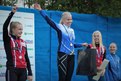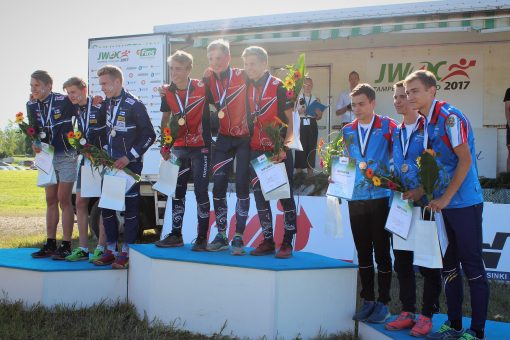 Essun miehiä JWOC-viestissä: hopeakorokkeella keskellä Aleksi Sorsa, pronssikorokkeella keskellä Kirill Komarov ja oikealla Mikhail Kuleshov. Kultakorokkeella Norja.