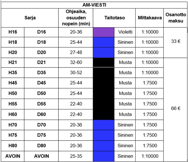Sunnuntain eGames-viestikilpailun ja Suunnistavan Uudenmaan AM-viestin sarjat ja osanottomaksut on esitetty taulukossa 2. Kaikissa sarjoissa kolme (3) osuutta. Viestikilpailun kaikkiin sarjoihin voi osallistua ilman SSL:n kilpailulisenssiä.