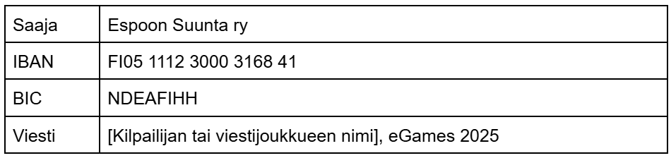 Espoon Suunta järjestää kansallisen kaksipäiväisen suunnistuskilpailu eGamesin 30.-31.8.2025. Lauantain 30.8. pitkän matkan kilpailussa ratkotaan samalla myös Uudenmaan aluemestaruudet. Vastaavasti sunnuntaina 31.8. viestissä kilpaillaan Uudenmaan AM-viestit. Pitkän matkan ohessa on tarjolla kuntosuunnistus ja viestikilpailussa kaikille avoin kuntosarja.