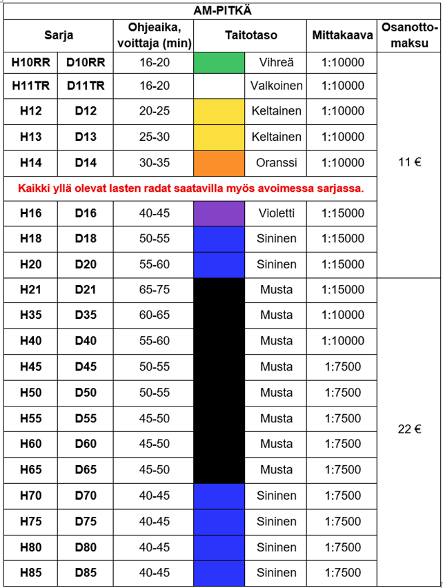 Lauantain pitkän matkan kilpailun ja Suunnistavan Uudenmaan AM-pitkän sarjat ja osanottomaksut on esitetty taulukossa 1. Lasten radoilla on myös avoimet radat, jotka voi juosta vaikka saattajan kanssa. Kansallisen kilpailun lisäksi lauantaina on mahdollisuus kuntosuunnistukseen (3 / 5 / 7 km) hintaan 12 €.