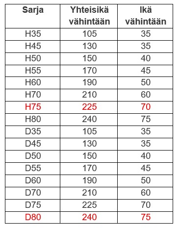 Taulukko 3, vähimmäisiät AM-viestin H/D35+ -sarjojen joukkueissa.