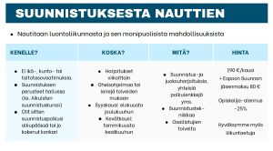 Ryhmässä treenaamista ohjaavat muut kuin kilpailulliset tavoitteet. Tärkeintä on yhdessäolo ja hienon lajin harrastaminen hyvässä porukassa. Kilpailuihin osallistuminen ja itsensä kehittäminen suunnistajana voivat olla tavoitteina, mutta tässä ryhmässä harrastajien toimintaa ei systemaattisesti tehdä tavoitteelliseksi eikä velvollisuuksia osallistumiseen ole. Tässä ryhmässä saat ryhmältä tukea ja tsemppausta sekä laadukasta valmennusta eTreenarien omalta ohjaajalta, Elisalta. Jokainen voi valita harjoituksensa ja tapahtumansa oman mielenkiinnon sekä ajallisten resurssiensa puitteissa.